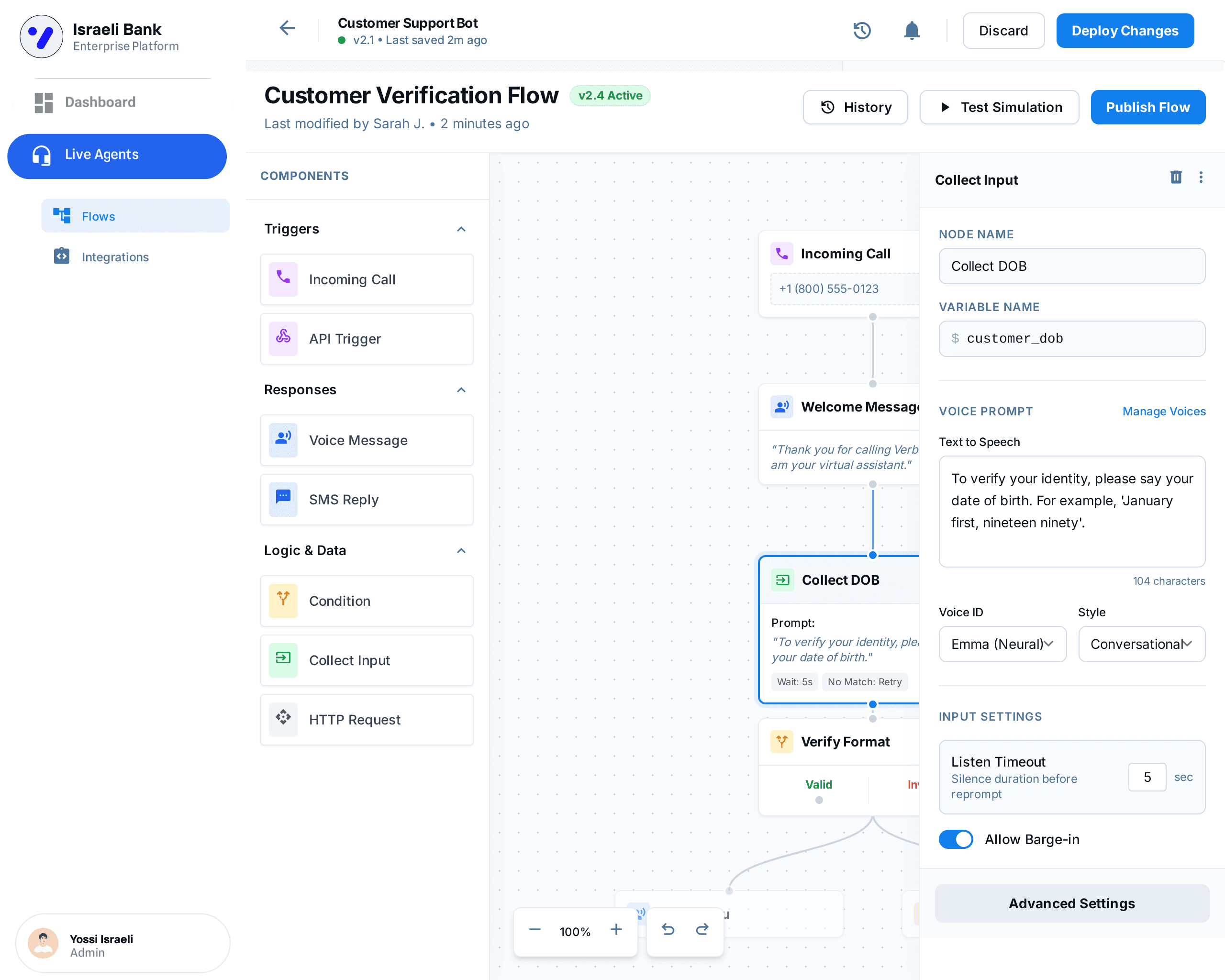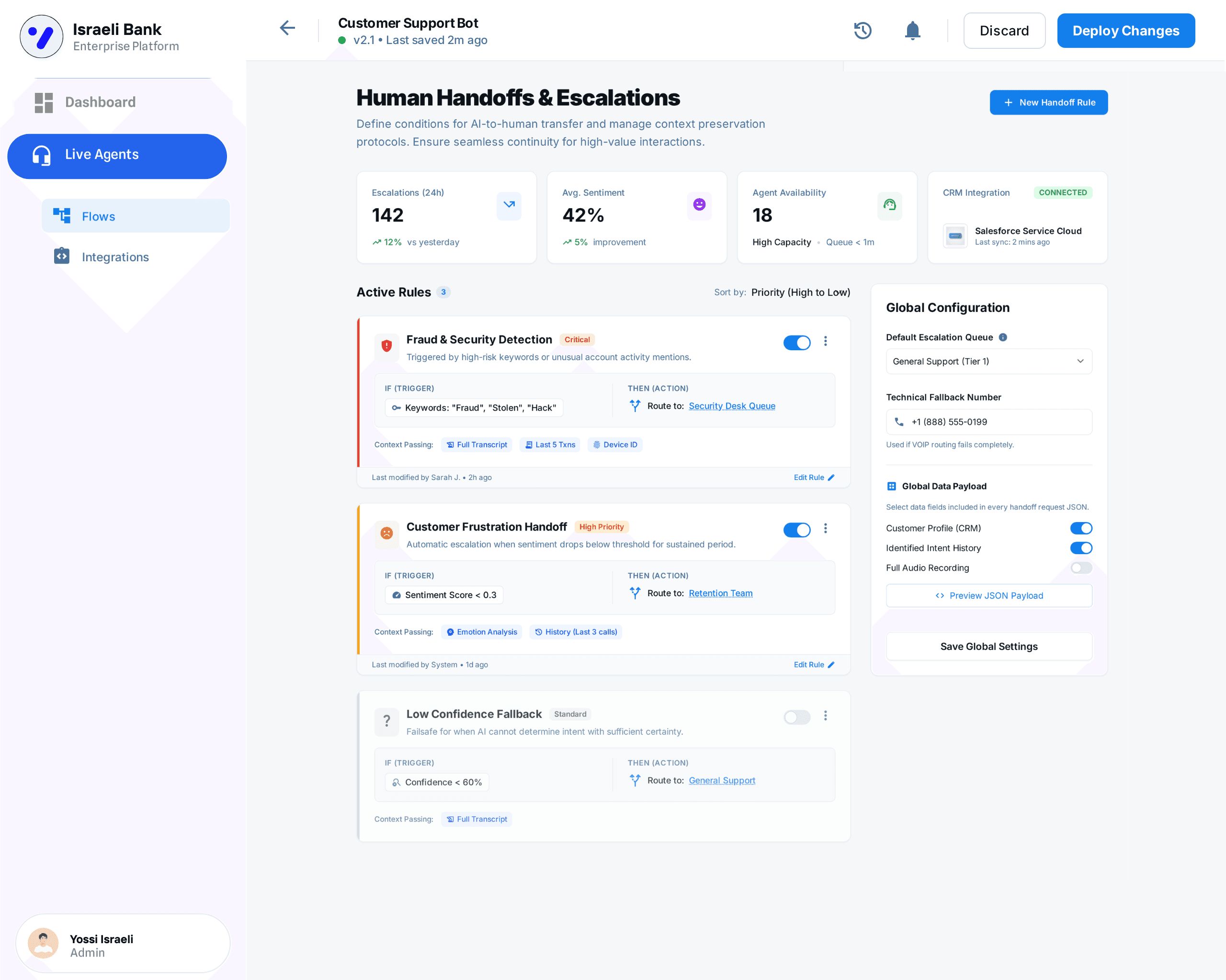 Build, visualize, and adjust conversation flows that determine how calls are routed, handled, and resolved. Control decision paths, escalation rules, and outcomes dynamically - without breaking live operations.